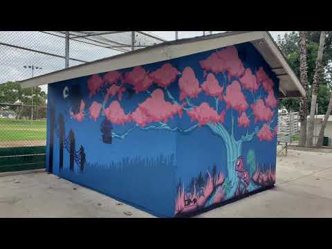 'Little League, Big Dreams' is an Art In Public Places (AIPP) mural commissioned by the City of Pomona, CA and the City of Pomona Cultural Arts Commission. It is painted on the storage building located at Welch Park, Pomona, CA.