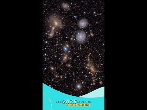 A field of galaxies scattered across the black of space. It is filled with galaxies of many shapes, sizes and colors, as well as the bright multi-colored points of stars. The image focuses on a collection of interacting galaxies connected by delicate streams of stars. Like spider silk, these stellar bridges link the large elliptical to the few larger galaxies beneath.
